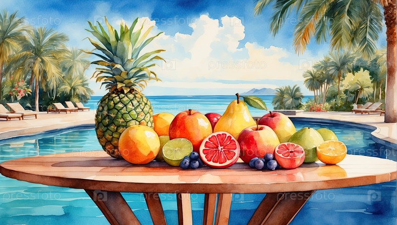 Ручная акварельная иллюстрация экзотических фруктов и ягод на деревянном столе, курорт с бесконечным бассейном, еда для летних каникул, все включено тропическое питание, художественный декор