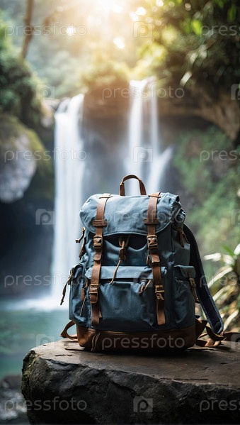 Синий рюкзак экспедиции на лесной скале, двойной водопад, ярко-зеленые тропики, треккинг, путешествия, спорт, походы, здоровое приключение, объявление о наружном оборудовании, дикая жизнь