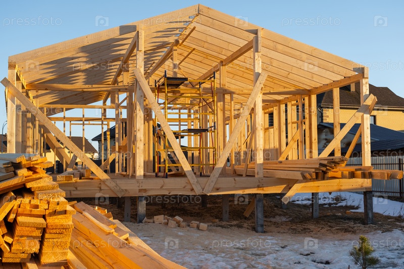 Сборка каркасного дома, деревянный скелет, балки, столбы на месте, элементы опоры, поддержка фундамента, современное плотничество, прогресс строительства площадки, установка