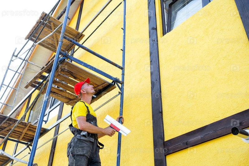 Пластировщик мастер уровни фасадной стены с трофеем, применение соединения, гладкое, декоративная отделка, частный бизнес по ремонту, обслуживание внешней части здания