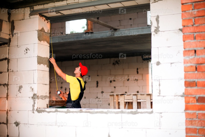 Измерение открытия окна геодезистом, подготовка к установке окон, работы на строительной площадке, проверка размера рамы, специалист по ремонту и перестройке домов