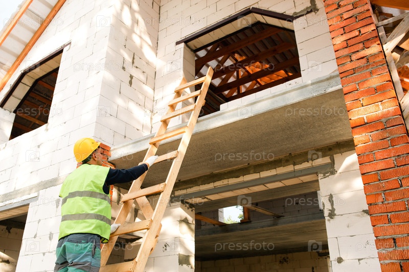 Строитель устанавливает лестницу для доступа к крыше, начинает строительные задачи, настройку площадки, брифинг по безопасности для команды, кирпичное дело, процесс строительства, проект дома