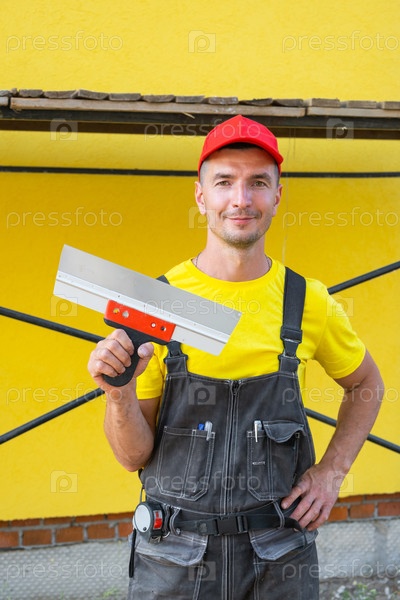 Портрет строителя, держащего штукатурный трофей, стройплощадка, частный бизнес по ремонту дома, услуги ремесленника, DIY, ремонт стен самостоятельно, навыки