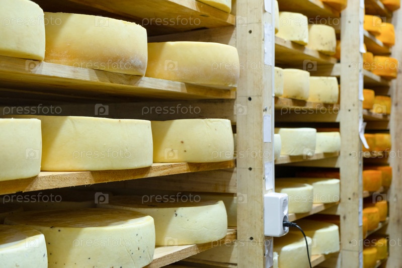 Естественный сыр, складываемый для старения, контролируемая среда, фермерский бизнес, различные сорта, деревянные полки, комната созревания, качественные органические продукты
