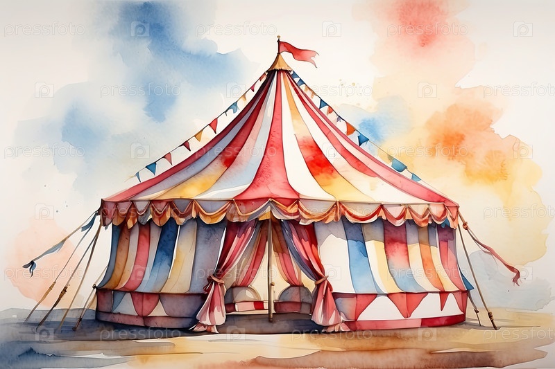 Акварельный цирковый купол с флагами - классическая яркая палатка для плакатов, билетов, баннеров, приглашений на вечеринки, детских и семейных мероприятий, веселая атмосфера, волнение и ожидание