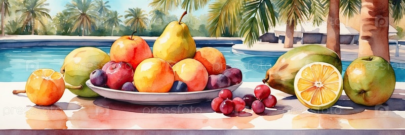Иллюстрация акварели: тарелка с манго, ананас, киви в отеле Sunny Pool, экзотический курорт, еда "все включено", оздоровительный туризм, летний баннер, меню-арт для промо путешествий