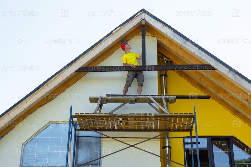 Человек прикрепляет более низкие декоративные элементы к габлу, использует лестницу и скелеты, внешние детали дома, процесс установки, современный стиль