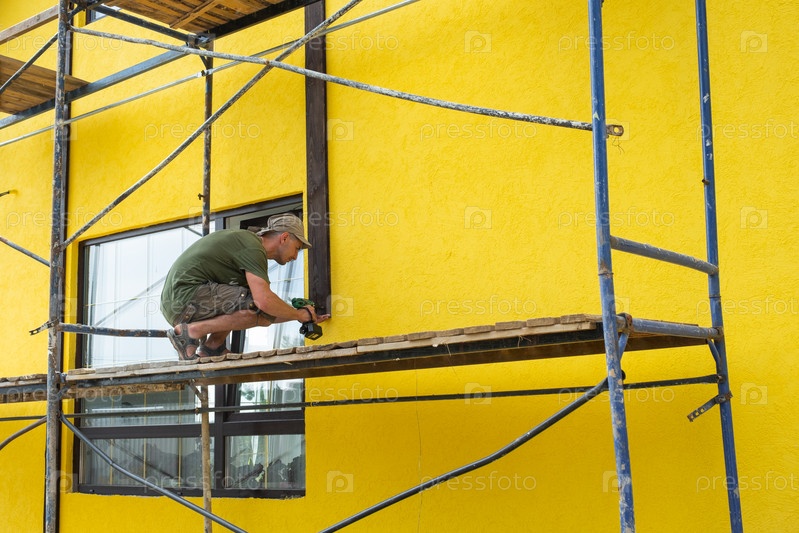 Леса для покраски и отделки стены, желтая краска, нанесенная на гипс, рабочий, декор фасада, эффект полудревесины с деревянными досками, архитектурные детали