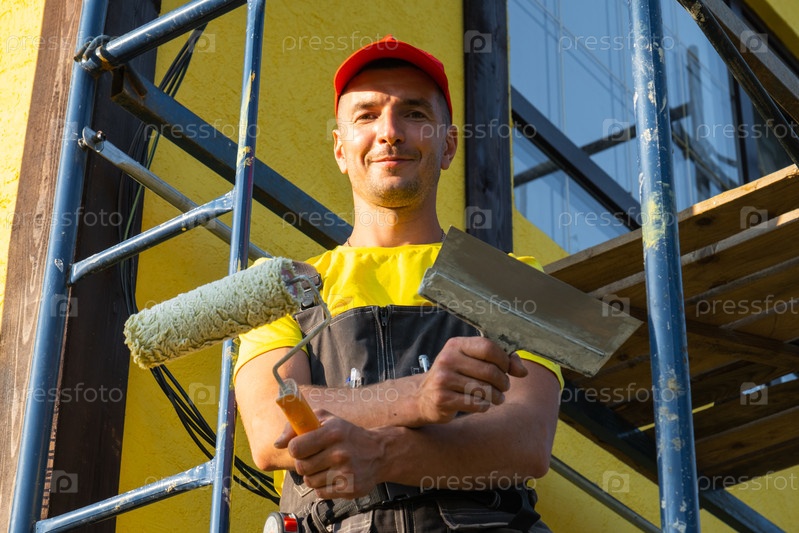 Портрет молодого строителя с большим роликом краски, ремонт фасада, работы на лесомашинах, обслуживание, домашний визит, полный сервис уборщика, инструменты для ремонта