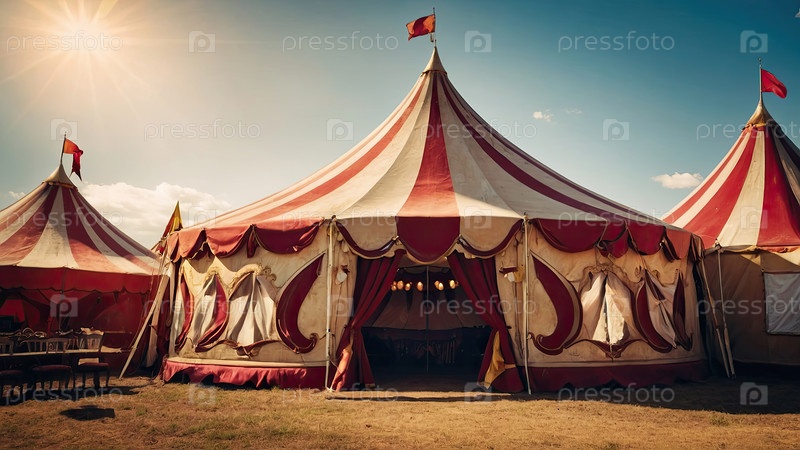 Дневной цирковый палаточный купол ? полосатый, праздничная атмосфера, приглашение на мероприятие, партийный плакат, билет, брендинг для семейного фестиваля, радостное и красочное настроение