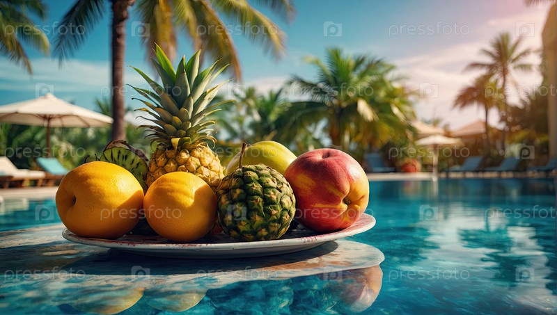 Гостиничный тропический бассейн с ананасом, манго, миской из фруктов киви, путешествие со всем включенным, завтрак-буфет, кампания по питанию, промо курорта, красивый баннер еды