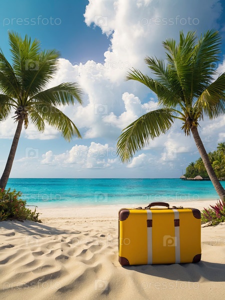 Два желтых чемодана на белом песке среди пальм, роскошный пляжный курорт, свежая туристическая промо-акция, семейные путешествия, турпродажи, маркетинг турагентства, текстовая зона для баннера