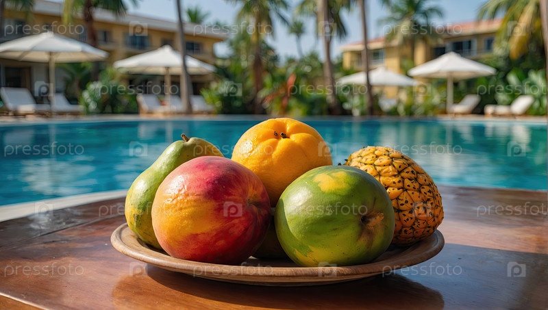 Тарелка экзотического манго, плод страсти, гуава на деревянном столе, отель с бассейном, питание "все включено", тропический завтрак, здоровое питание, летний туризм