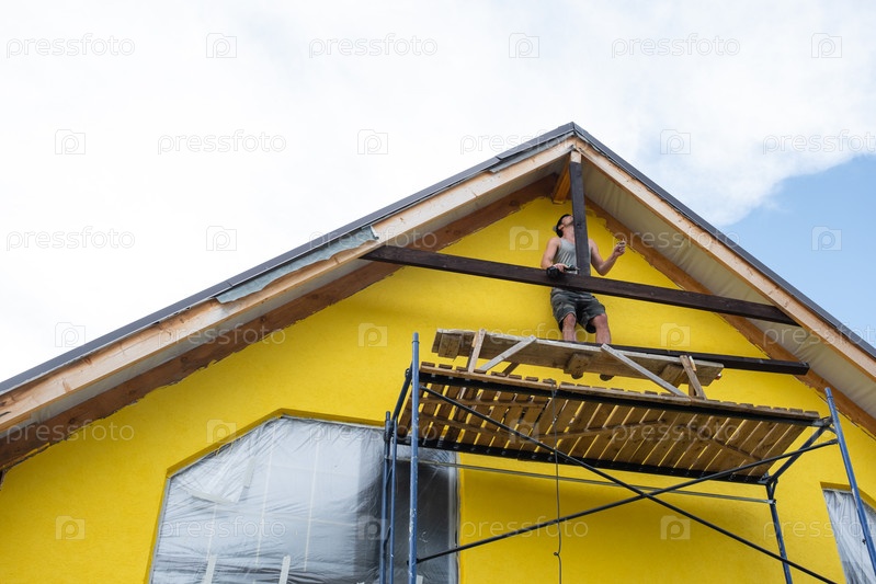 Передний угол дома с видимыми скелетами и незавершенной декоративной отделкой, жилая архитектура с деревянными работами в процессе