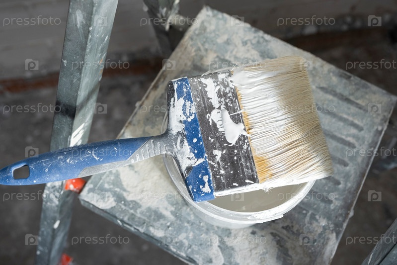 Лестница с краской и кистью, поверхностная подготовка к покраске, отделка дома, ремонтные работы, улучшение интерьера, детали оформления комнаты