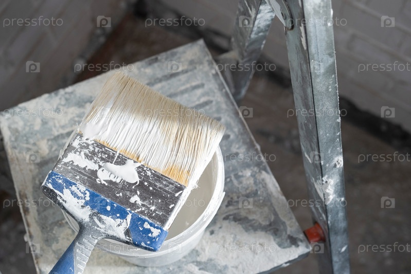 Покраска кистью и ведрой на лестнице, детали для покраски стен в помещении, ремонтные работы, улучшение дома и отделка интерьера, подготовка декора