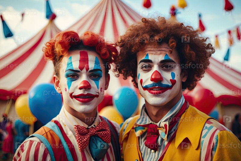 Группа цирковых клоунов, партийный портрет ? забавные лица, макияж на выступлении, реклама мероприятий, детское шоу, брендинг фестиваля, семейное празднование детей, игривый визуальный