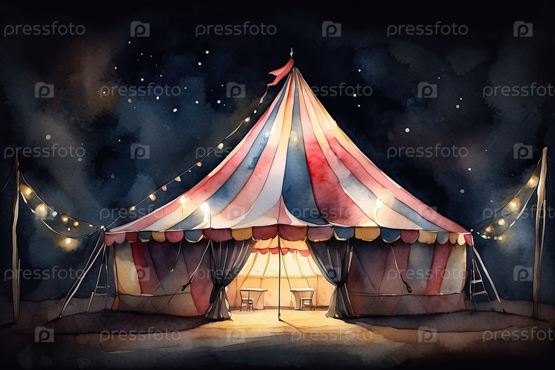 Акварельный цирковый купол ночью ? светящаяся палатка, ночная фестивальная атмосфера для плакатов, билетов, баннеров, магических вечерних мероприятий, вызывает тайну, волнение, наслаждение