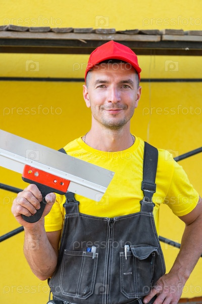 Ремесленник в желтом, держащий большой нож с лепниной, ремонт на дому, частный строительный бизнес, самостоятельное улучшение дома, профессиональная установка инструментов