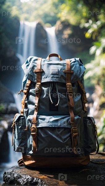 Профессиональный рюкзак для походов в горный лес, возле каскадного водопада, концепция выносливости, путешествия, спортивный туризм, приключенческое оборудование, дикие пейзажи и активные каникулы