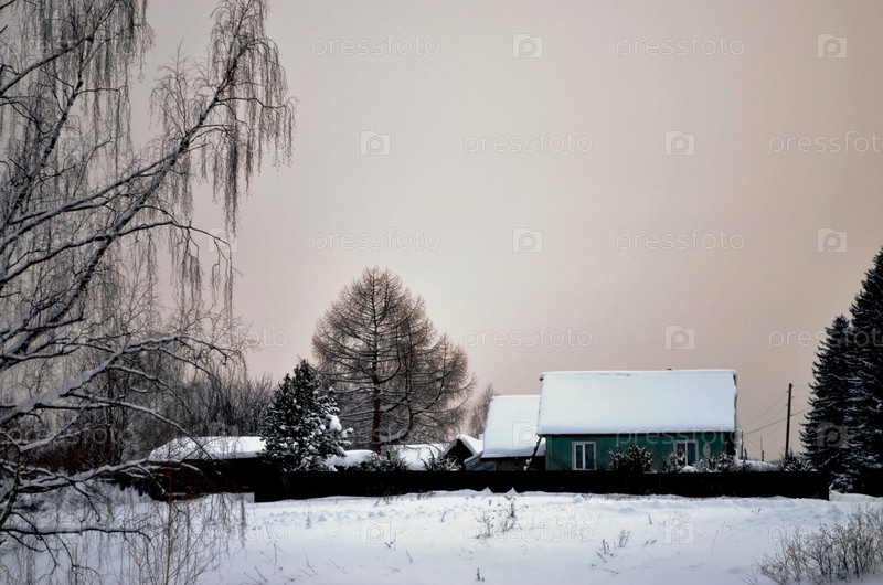 Сельский зимний пейзаж с деревянным домом вдалеке