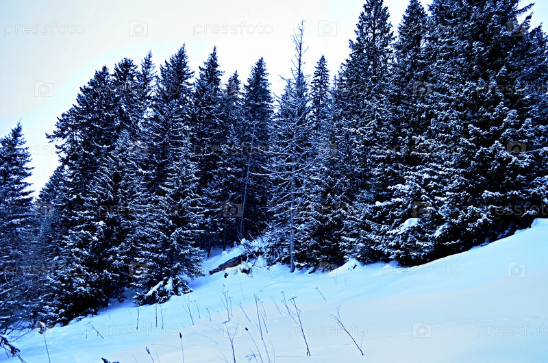 Зимний горный пейзаж. Заснеженные ели