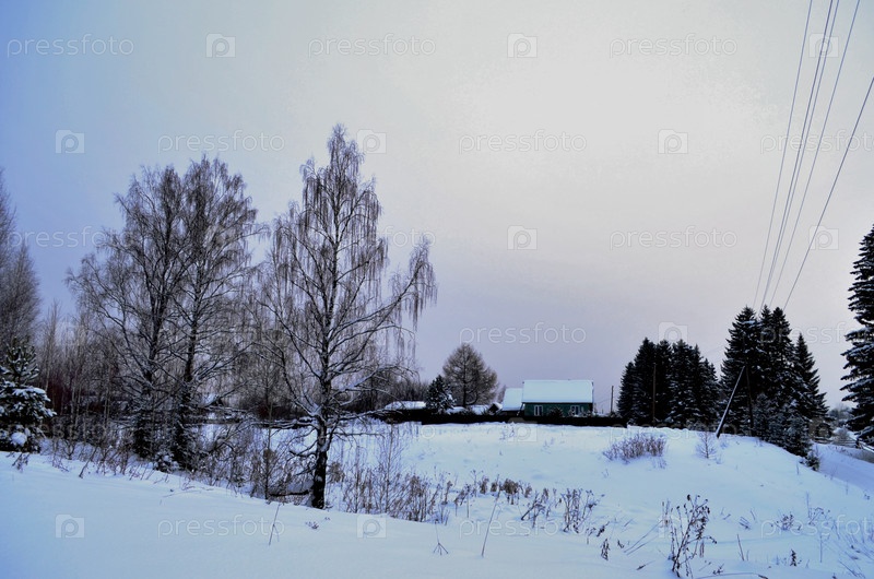 Сельский зимний пейзаж с березами и деревянным домом вдалеке