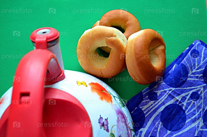 Яркий контрастный натюрморт с баранками, синим платком, красным чайником на зеленом фоне
