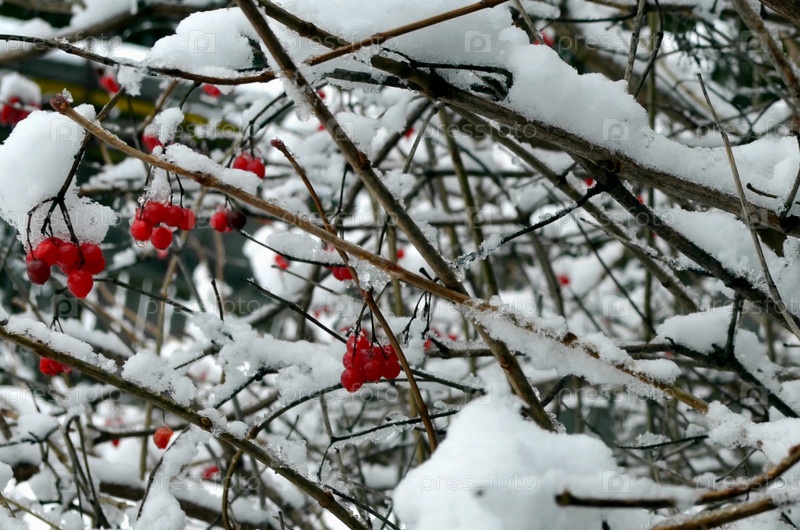 Заснеженные ветки калины с красными ягодами зимой крупным планом