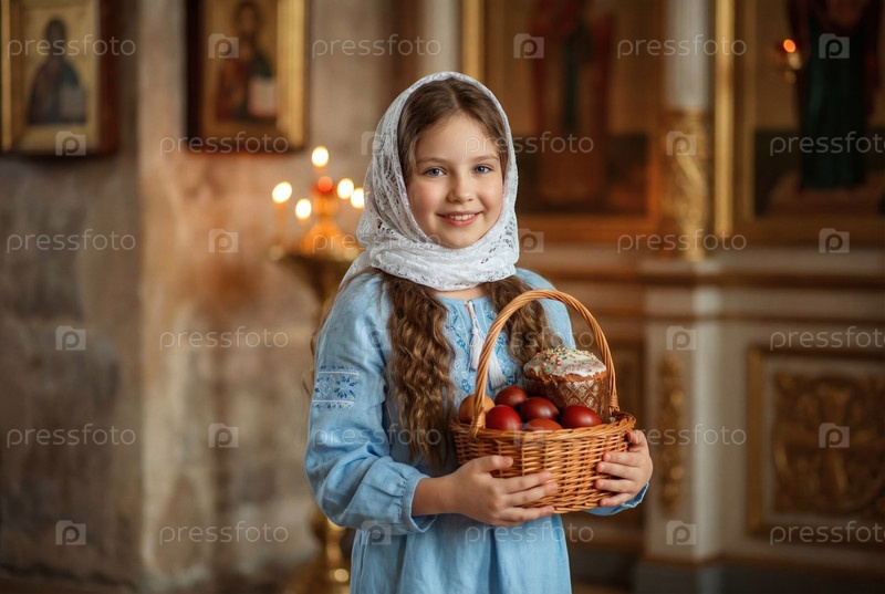 Религия и вера.Счастливого Пасхи.Портрет маленькой девочки в русском народном шарфе с плетеной корзиной пасхальных яиц и пасхального кулича внутри церкви
