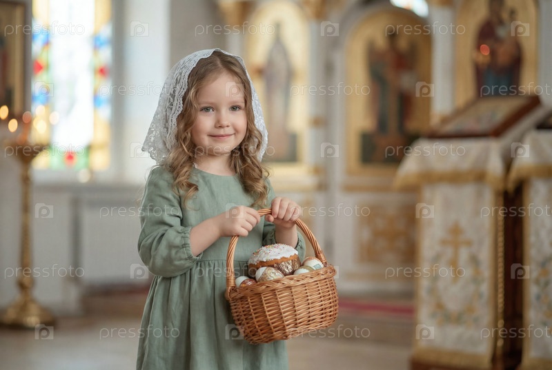 Религия и вера. Счастливй Пасхи. Портрет маленькой девочки в русском народном шарфе с плетеной корзиной пасхальных яиц и пасхального кулича внутри церкви