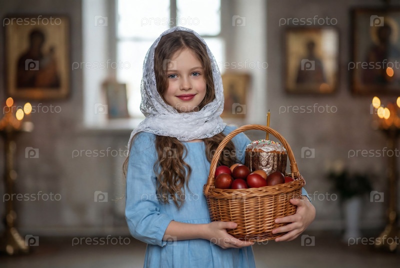 Религия и вера. Счастливй Пасхи. Портрет маленькой девочки в русском народном шарфе с плетеной корзиной пасхальных яиц и пасхального кулича внутри церкви