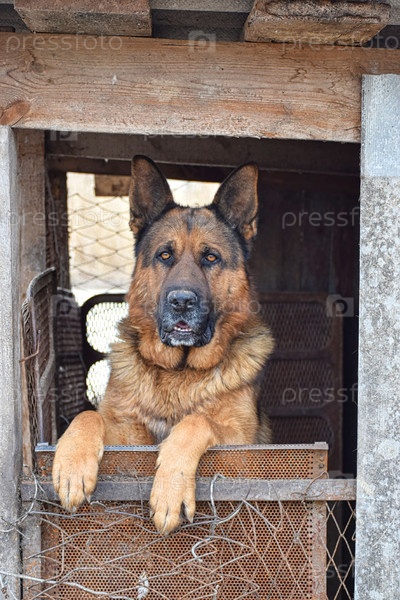 Сторожевой пес в будке. Немецкая овчарка в деревянной будке сторожит участок