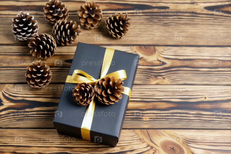 Подарочная коробка с сосновыми шишками и лентой, расположенной на деревянном столе