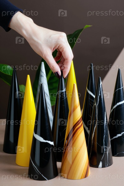 Кавказская женщина Молодой взрослый рукой устраивает декоративные мраморные конусы в помещении