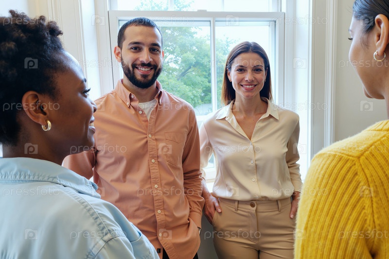 Мультиэтнические молодые взрослые улыбаются и разговаривают возле окна в помещении