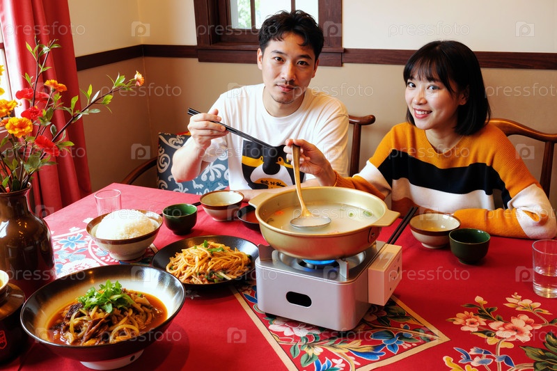 Молодой азиатский мужчина и женщина наслаждаются горячим блюдом вместе за столом