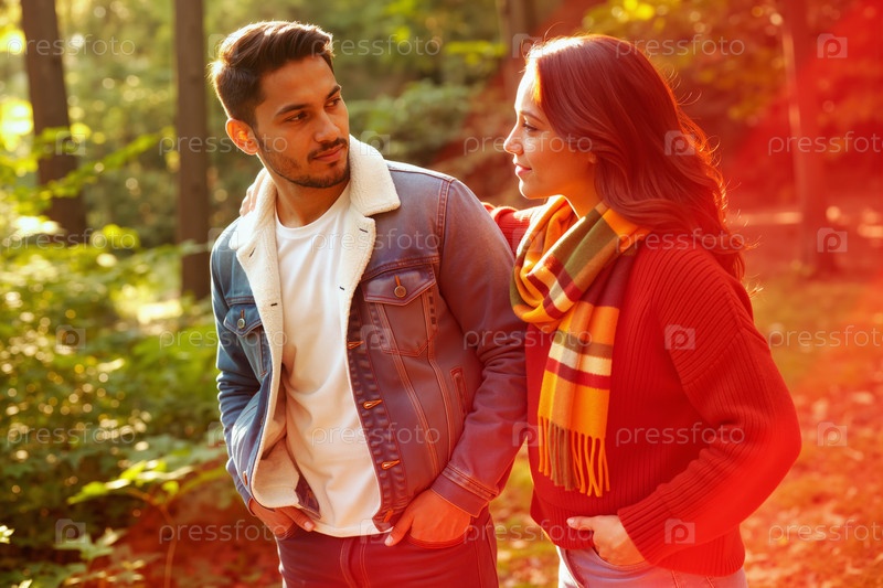 Молодой латиноамериканский мужчина и женщина вместе гуляют в осеннем лесу