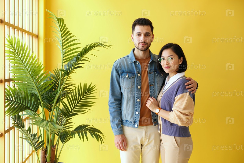 Портрет молодого белого человека и молодой азиатской женщины, стоящих вместе и улыбающихся