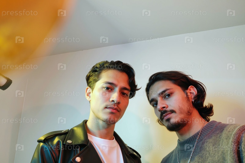 Портрет двух молодых взрослых латиноамериканских мужчин, смотрящих на камеру в помещении