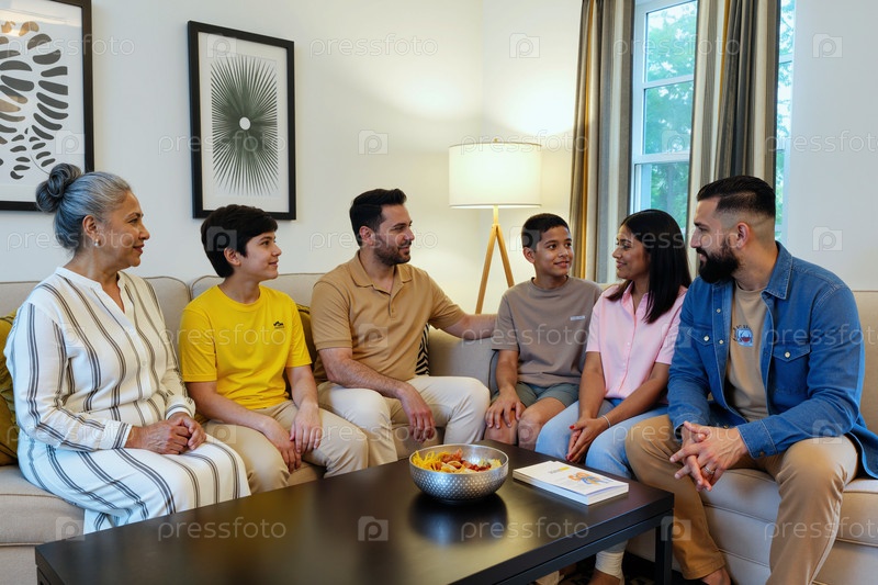 Испанская семья сидит вместе на диване, улыбается и ведет беседу