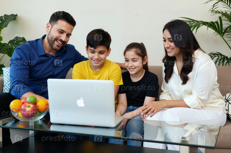 Испанская семья смотрит видео вместе на ноутбуке и улыбается дома