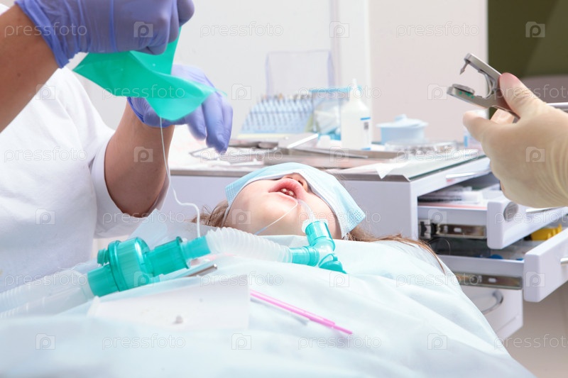 Ребенок находится под анестезией. Дыхательная трубка во рту. Лечение молочных зубов под наркозом. Открытый рот. Шкаф в руках у стоматолога. Современная стоматология