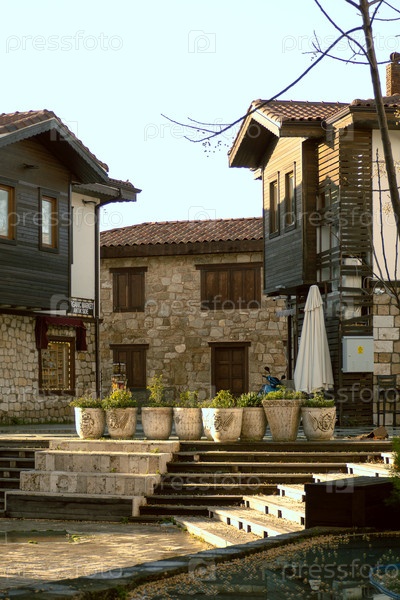 Улица старого города с домами в лучах закатного солнца в Сиде, Турция