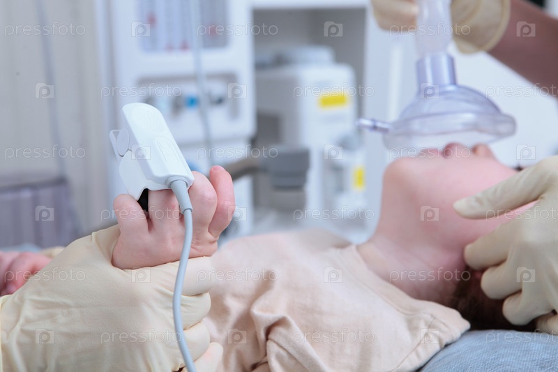 Пульсоксиметр на пальце ребенка. Подготовка к операции. Ребенок находится под общей анестезией. Маска для дыхания надевается на лицо. Лицо ребенка нефокусно
