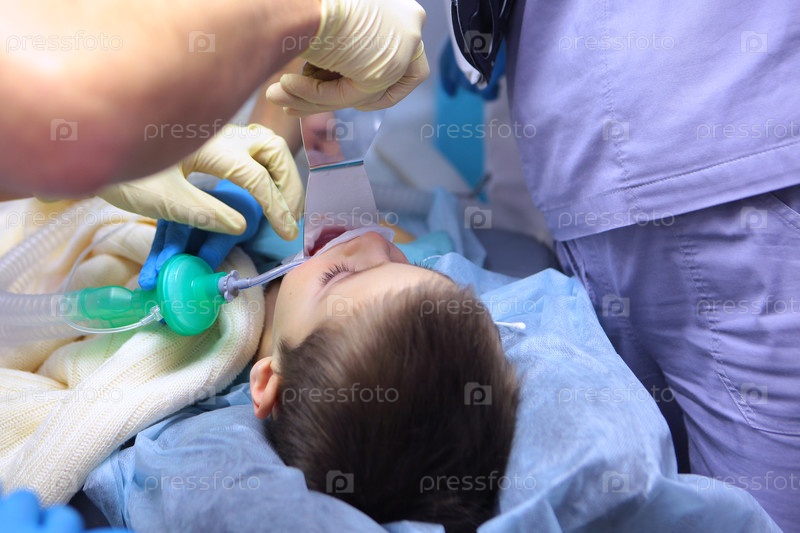 Маленького мальчика готовят к стоматологическому лечению под общей анестезией. дыхательная трубка в горле ребенка. одноразовый зубной ретрактор для полости рта