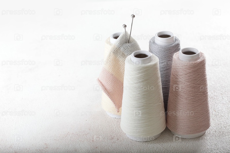 Нить для вязания на катушках. Хлопковая нитка в теплых тонах. Трикотаж - это хобби. Шаблон трикотажа. Пространство для копирования. Светлый фон