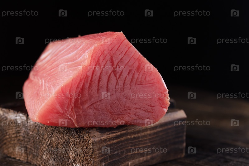 Большой кусок свежего тунца. Тунец для стейка. Свежая рыба. Здоровое и питательное блюдо. Природные омега. Темный фон