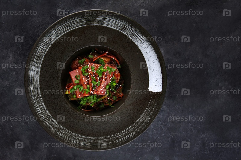 Туновый вак. Соба-нудлы с овощами и соусом терьяки. Традиционное азиатское блюдо. Семена кунжута и зеленые луки. Здоровое питание. Плоская кладка. Вид сверху. Копирование пространства