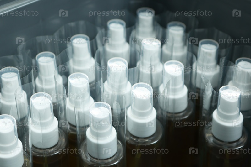 Большое количество бутылок с готовыми продуктами по уходу за кожей. Флаконы находятся в ящике. Производство косметики для ухода за кожей. Бутылка не имеет этикетки